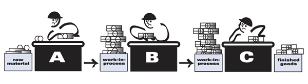 A mass production approach to operations in which large lots (batches) of items are processed and moved to the next process—regardless of whether they are actually needed—where they wait in a line (a queue).