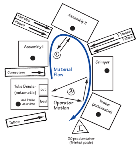 A U shape (shown below) is common because it minimizes walking distance and allows different combinations of work tasks for operators. This is an important consideration in lean production because the number of operators in a cell will change with changes in demand. A U shape also facilitates performance of the first and last steps in the process by the same operator, which is helpful in maintaining work pace and smooth flow.