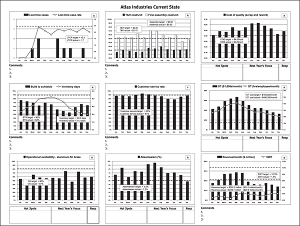 A one-page measurement tool comprising the critical few end-of-pipe (downstream) and process (upstream) measures related to a strategy or action plan (see illustration). It helps a leader check and adjust a plan and provides real-time measures for real-time feedback. Value-stream maps and dashboards are complementary tools: Maps raise critical questions to be addressed during the plan phase of the plan-do-check-act cycle. Dashboards raise questions for leaders to address during the check and act phases.