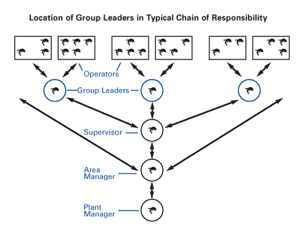 At Toyota, these are the front-line supervisors who typically lead a group of four teams or 20 workers; called kumicho in Japanese (see illustration below).