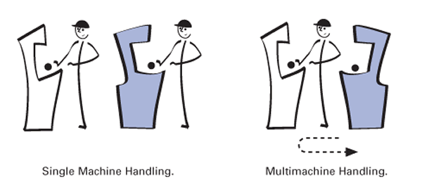 The work practice of assigning operators to operate more than one machine in a process village layout. Requires the separation of human work from machine work, and usually is facilitated by applying jidoka and auto-eject to the machines.
