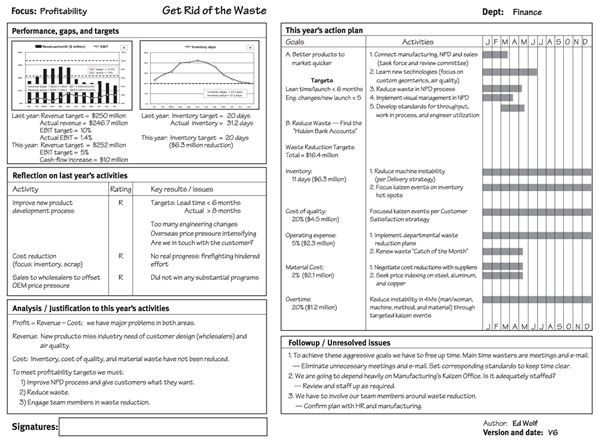 The example A3 below shows the strategy of a finance department director for returning a company to profitability (Dennis 2006, p.103). The Performance box in the upper left corner illustrates that the company missed its revenue and EBIT targets the previous year. It also shows inventory levels because the director considers it to be the company’s biggest waste and a serious drag on cash flow. The “R” for “red” rating in the Reflection box shows that key improvement efforts didn’t work last year. The Analysis below it shows the top actions that must be done to achieve this year’s strategic objective of profitability. The Action Plan on the right provides the who, what, when, where, and how of the strategy. The Followup box displays any lingering concerns and how the director will check on progress.