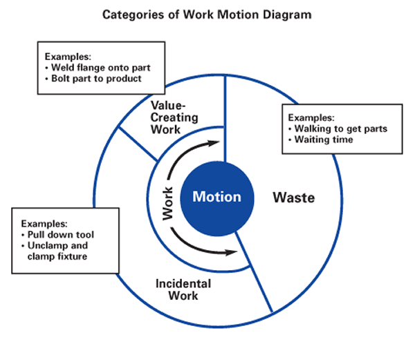- Waste: Motions that create no value and can be eliminated, such as walking to get parts or tools that could be positioned within reach.